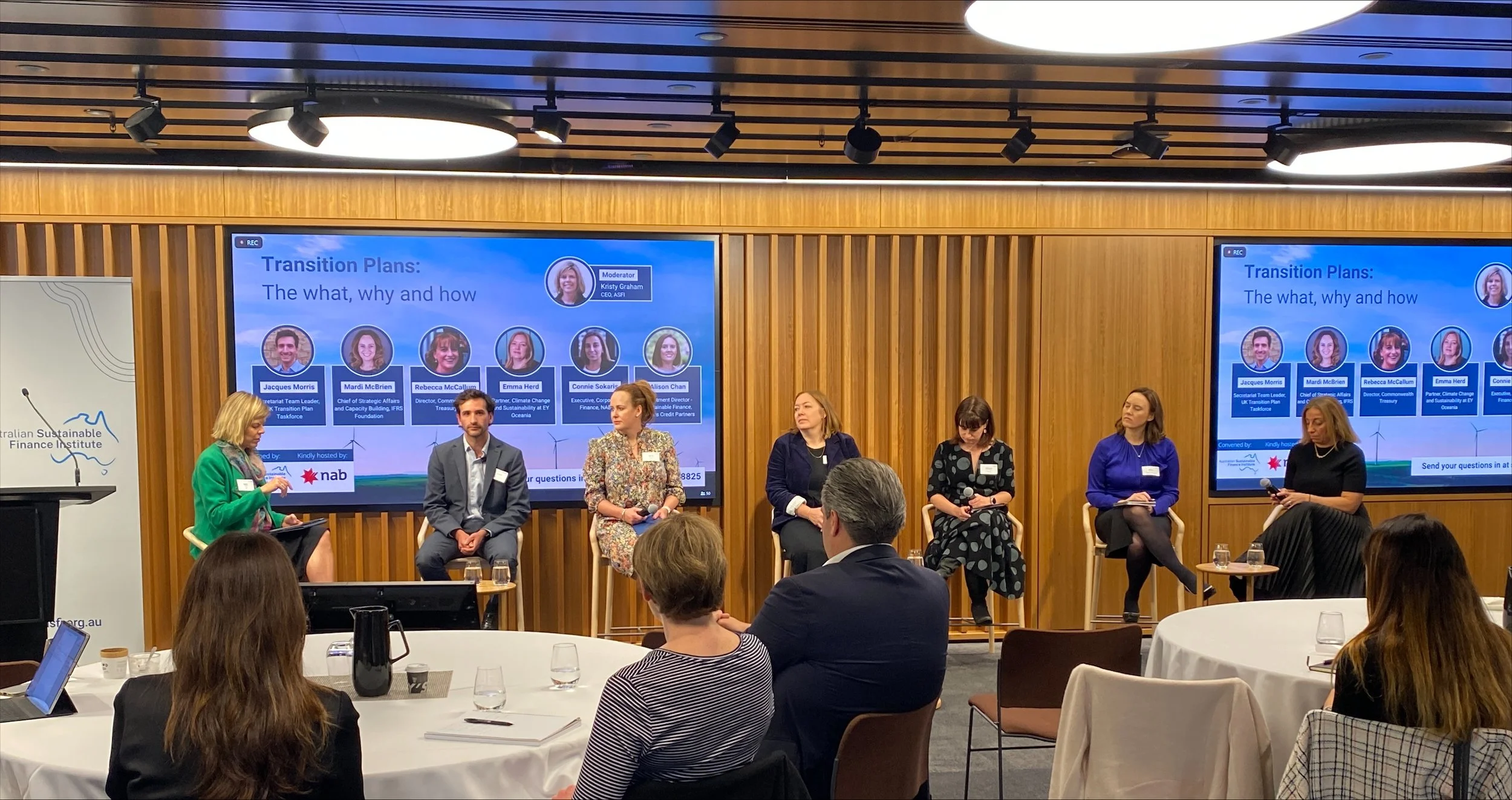 Panelists (left to right): Kristy Graham (CEO, ASFI) [moderator], Warren Tease (Chief Advisor, Financial Markets, Commonwealth Treasury), Linda Romanovska (Independent Member of the EU Platform on Sustainable Finance), Kristin Tilley (Australia’s Climate Change Ambassador), Ritesh Thakkar (Senior Advisor Asia Pacific, Convergence Blended Finance) [on screen].Friday May 26 saw ASFI bring together our members and representatives from across the finance sector, government and industry to discuss ‘the what, why and how of transition plans’. Our panel featured UK Transition Plan Taskforce (TPT) Team Lead Jacques Morris, IFRS Foundation’s Mardi McBrien, Commonwealth Treasury’s Rebecca McCallum, EY’s Emma Herd, NAB’s Connie Sokaris and Metrics Credit Partners’ Alison Chan. The insights shared underscored that transition plans are no longer a “nice to have” but a “necessity”, and the clear support for the role of guidance in supporting the standardisation and rigor of transition plans. In case you missed it, please see the event recording. Many thanks to NAB for hosting this event with us, the Energy Efficiency Council and Climateworks Centre for bringing Jacques Morris to Australia, and the expert audience who joined us in person and online.